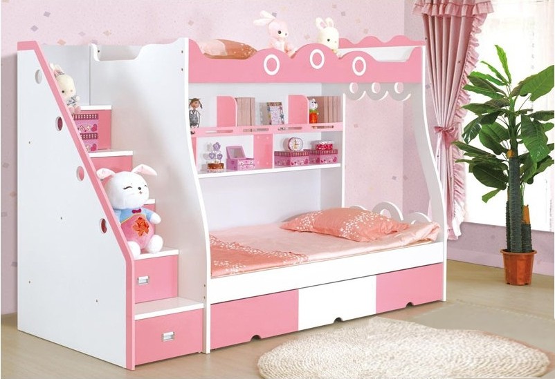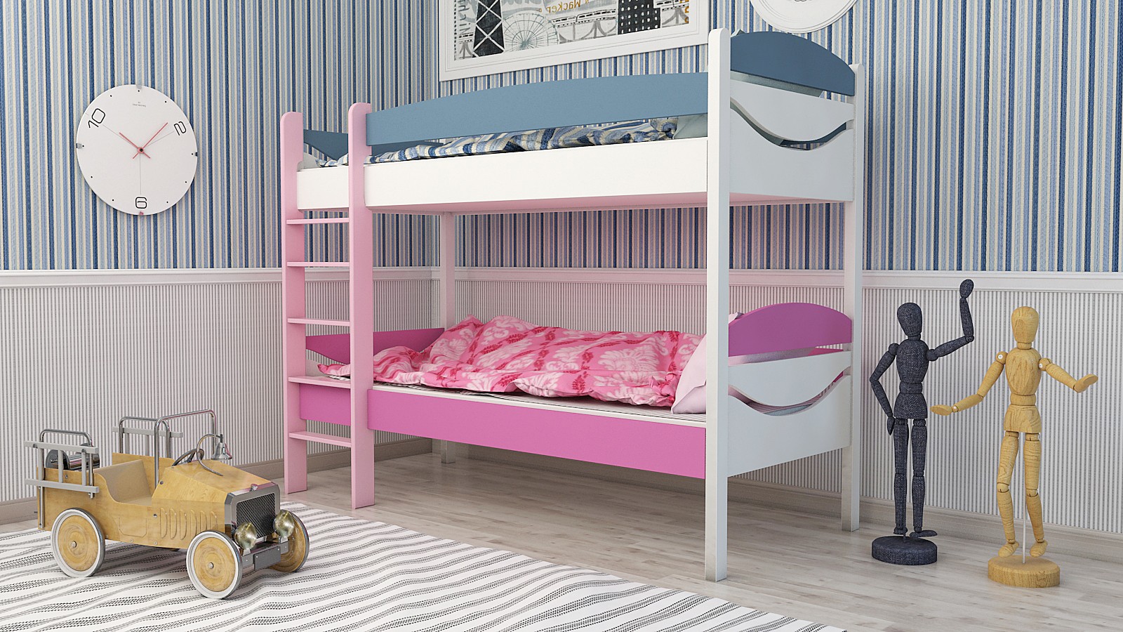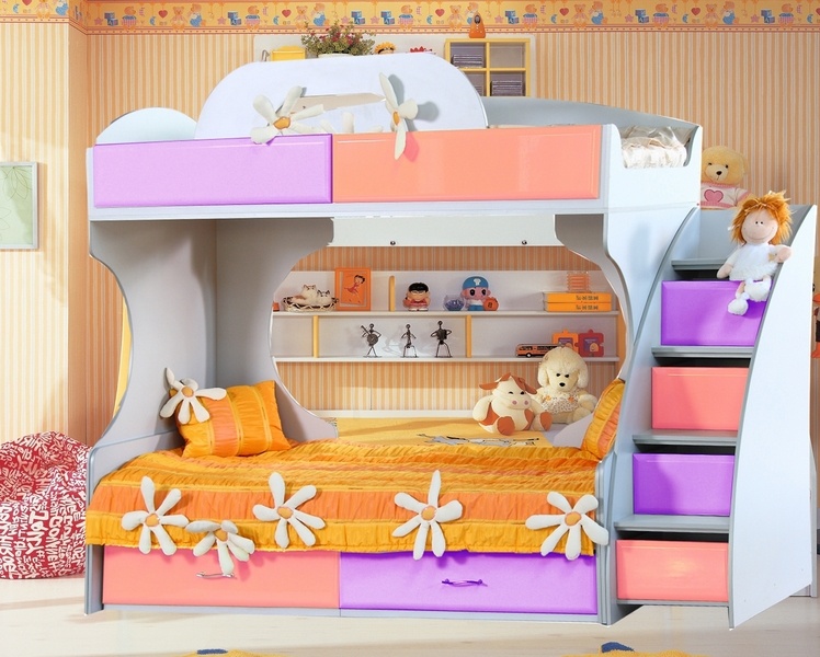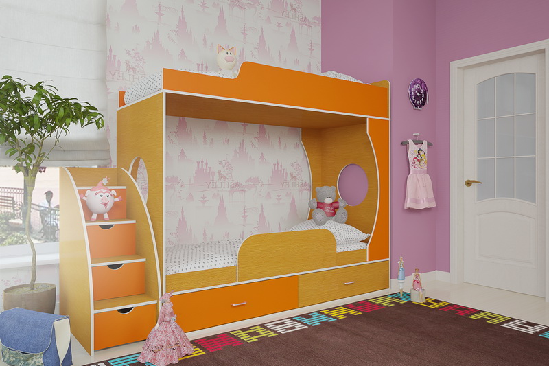 Si les deux enfants ont le même âge, veillez à choisir le modèle de lit superposé avec un haut degré de sécurité. Ces meubles ont des côtés protecteurs de tous les côtés, l'escalier menant au deuxième niveau est stable et comporte de larges marches, et tous les éléments sont solidement fixés à la structure.La photo suivante montre de tels meubles pour garçons et filles.