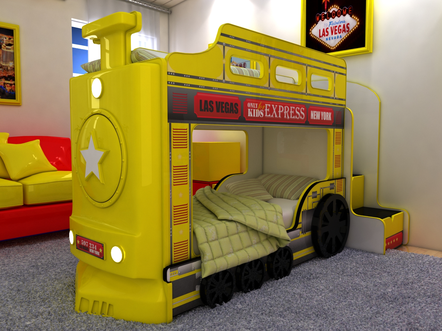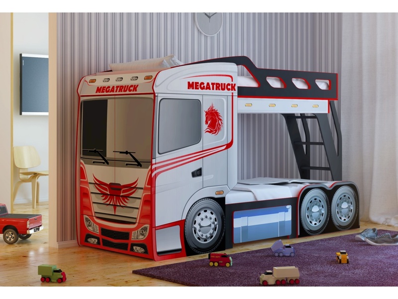 Le design inhabituel en forme de voiture convient mieux à un garçon. De plus, l'apparence de tels lits peut être très diverse (voiture de course, camion de pompiers, bus), ce qui contribue au développement de l'imagination et de l'imagination du bébé, rend sa vie quotidienne plus intéressante. Regardez la photo ci-dessous, à quel point la chambre des enfants est originale, décorée avec un tel élément décoratif.