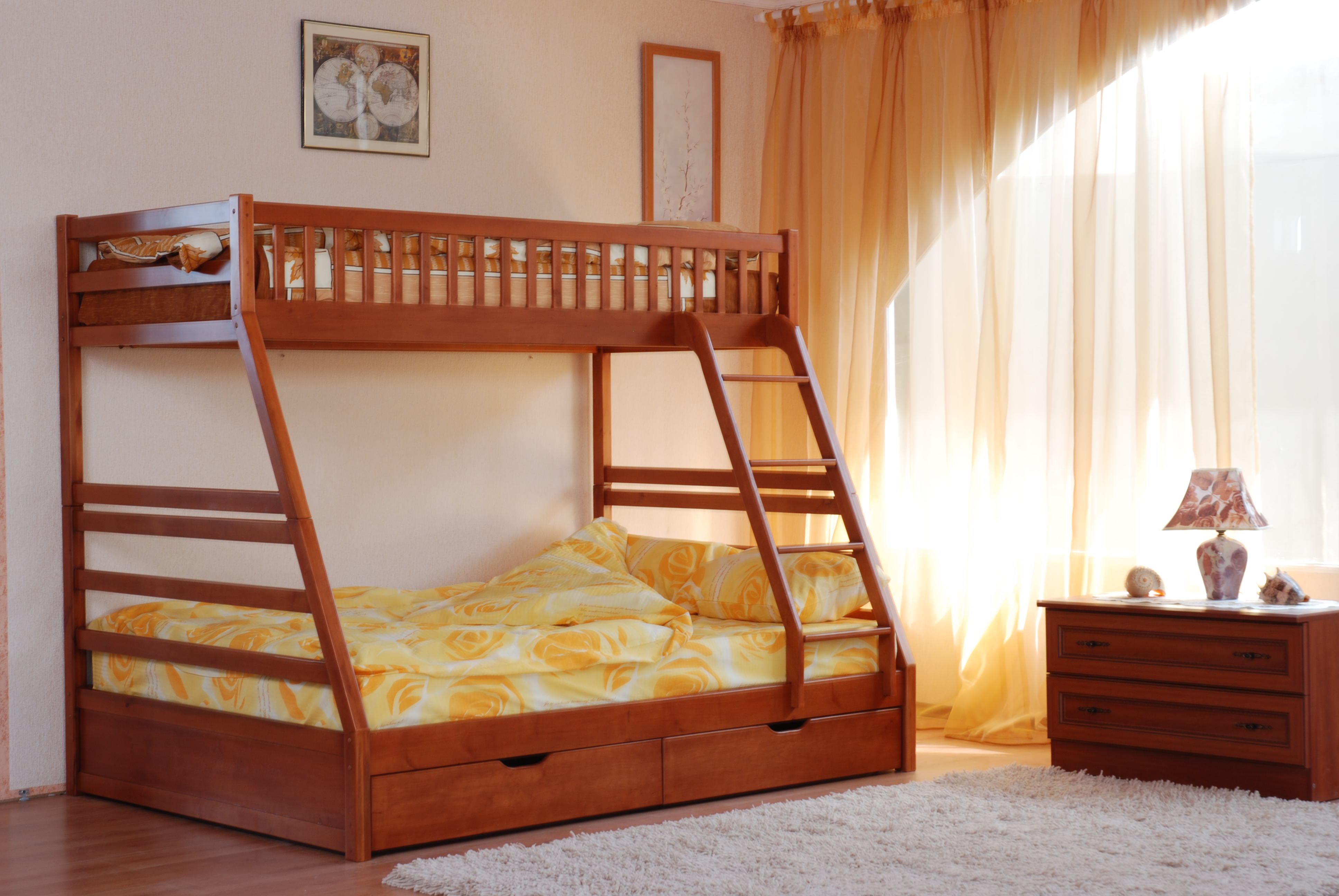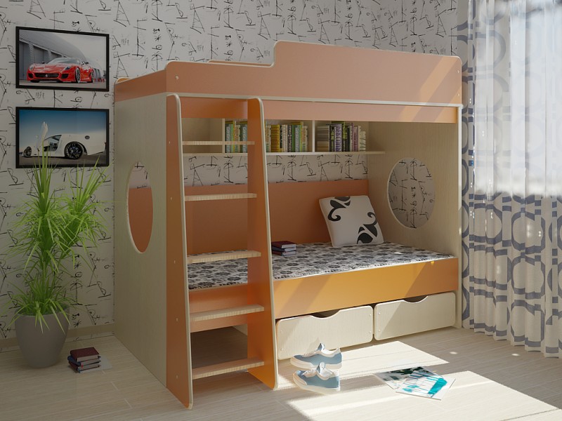 Ils s'intègrent dans n'importe quel design de pièce - Provence, high-tech, avant-gardiste, classique. Des lits inhabituels peuvent être réalisés sous la forme d'une maison ou d'une voiture. La couleur des produits peut être différente - blanc, rouge, bleu, jaune, etc. Les lits superposés conviennent à trois ou deux enfants de sexes différents.Equipé d'échelle, toboggan.