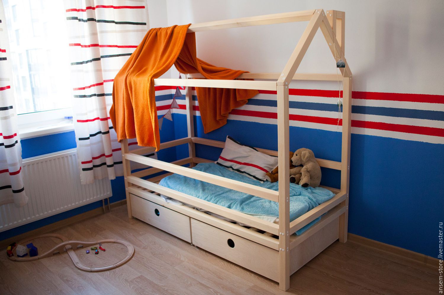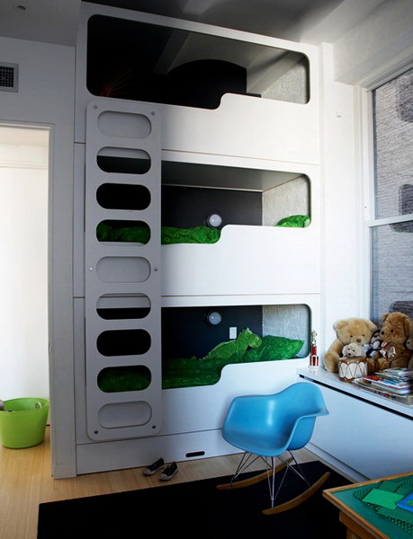 des lits inhabituels peuvent être réalisés sous la forme d'une maison avec de nombreux casiers, pouvant être utilisés pour deux enfants;