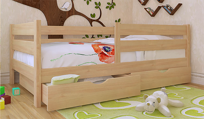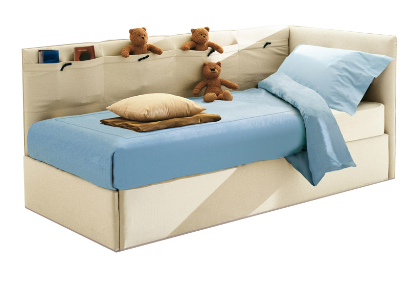 sur le côté - avec le lieu de couchage, il y a un socle supplémentaire, il est relié au cadre à l'aide d'une connexion rigide. En plus des tables de chevet, le dossier peut être démonté sous forme de table pour accueillir divers accessoires pour enfants ;
