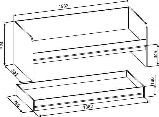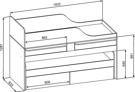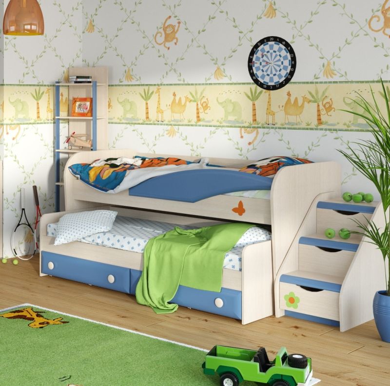 - avec mécanisme de traction et tiroirs. Des niches spacieuses vous permettent de ranger la literie et les choses. Le modèle est fonctionnel et pratique. Le lit à l'étage inférieur est situé à une hauteur suffisante du sol, après transformation il devient un lit à part entière ;