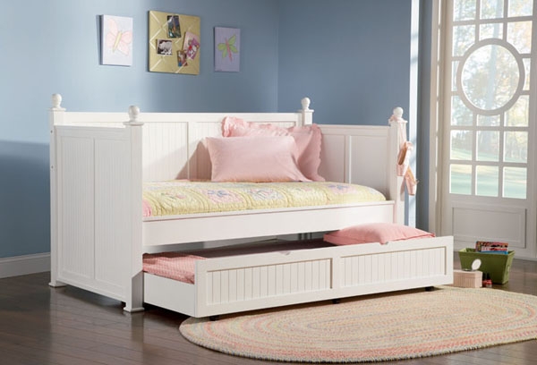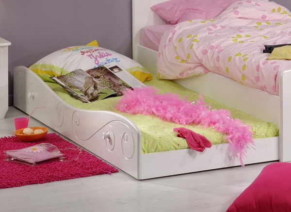 L'apparence d'un tel lit ne diffère pas significativement des options standard pour deux enfants. La différence peut résider dans la hauteur de l'un des niveaux de couchage, en dessous duquel se déplace le deuxième lit à tiroirs. Les rouleaux coulissants rendent la transformation facile et sans effort. Même un enfant est capable de faire face à cette tâche de manière indépendante.
