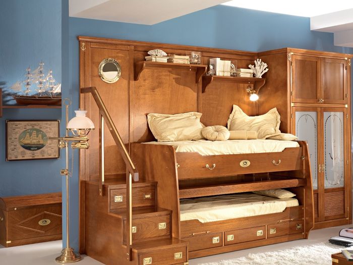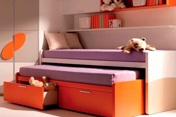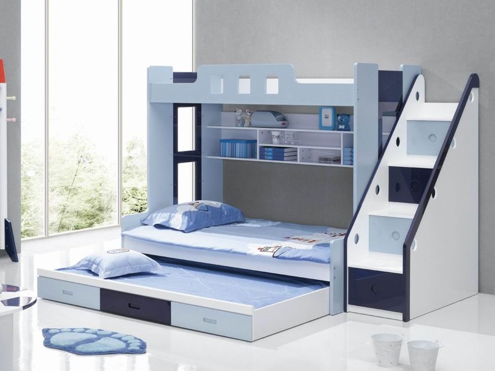 Les meubles pliants modernes pour deux enfants peuvent être à deux ou trois niveaux. La principale différence entre ces derniers réside dans les caractéristiques de conception. Au lieu d'être équipé de box, le niveau inférieur est occupé par un autre emplacement. La construction à trois niveaux est une seule unité, les lits sont fixes et non adaptés pour être séparés de la charpente principale.