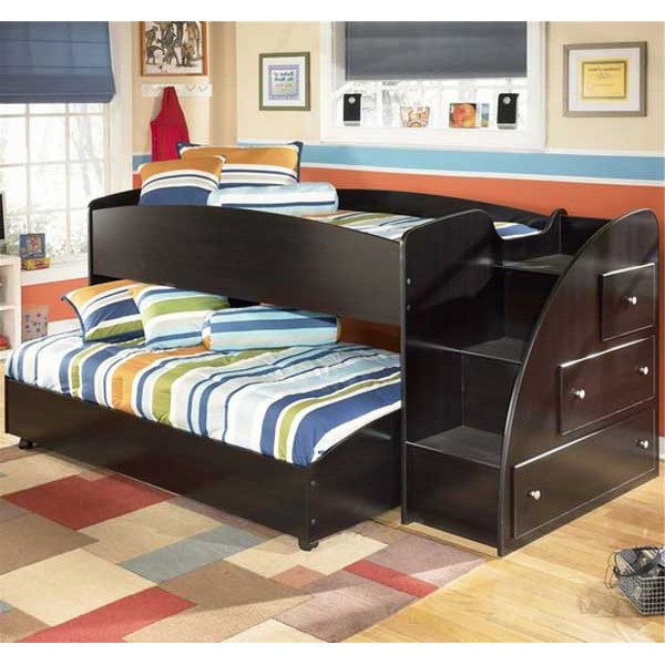 - avec des niveaux collés.La couche inférieure est réalisée dans toute la largeur, la longueur du produit et est fixée de manière inamovible, limitée par un mécanisme rétractable. La version classique pour deux personnes présente un inconvénient majeur où l'enfant qui dort sur le dessus est obligé d'enjamber la personne endormie en dessous pour descendre;