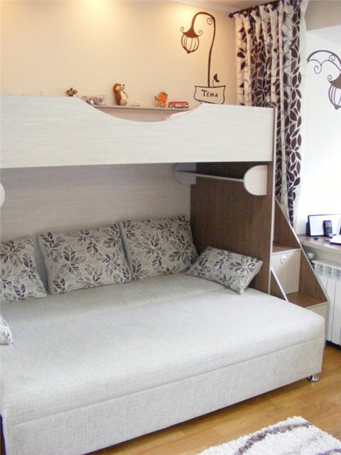 Les meubles ne sont pas moins utiles pour les petits sous à Khrouchtchev, où vivent deux enfants d'âges différents. L'espace limité de ces maisons oblige leurs propriétaires à trouver de plus en plus de nouvelles façons d'économiser de l'espace dans chaque pièce. En d'autres termes, le canapé plié est parfaitement adapté pour qu'un bébé dorme, et celui du haut pour un enfant plus âgé ou un adolescent.