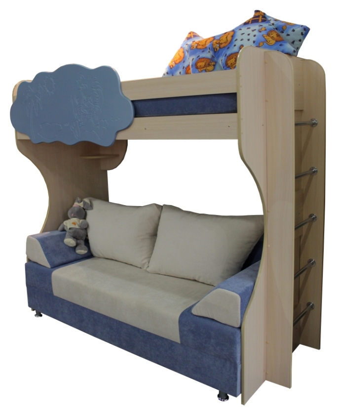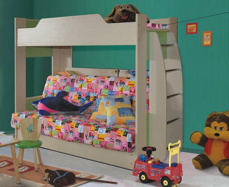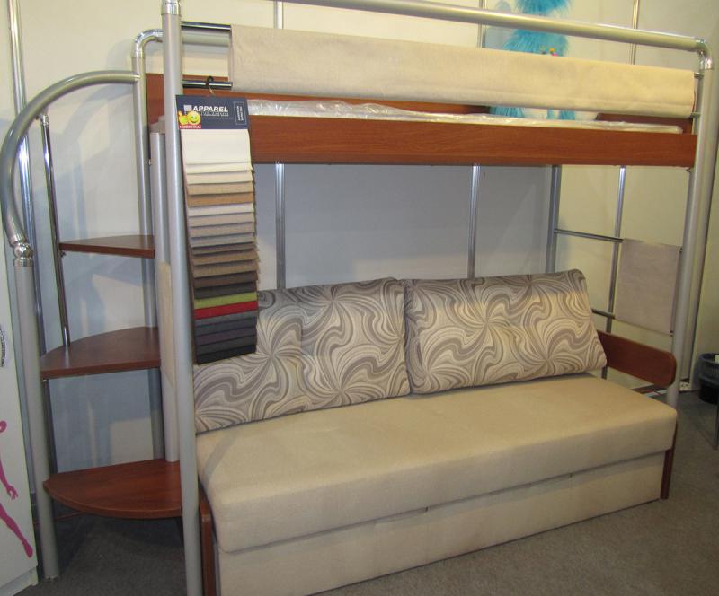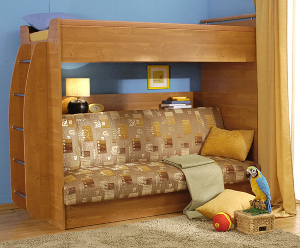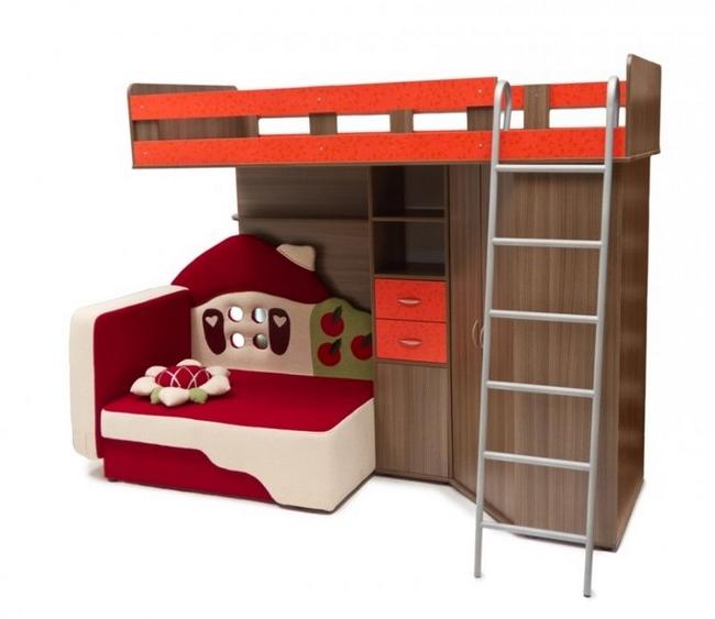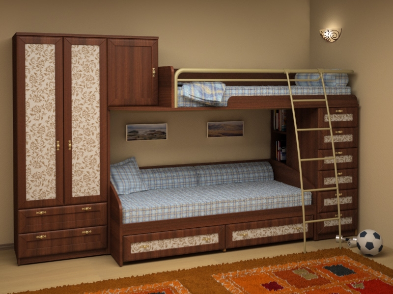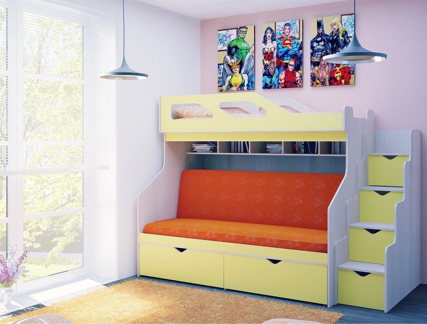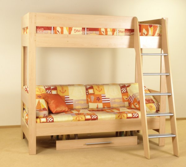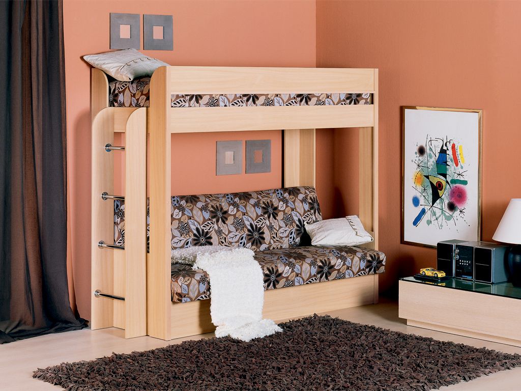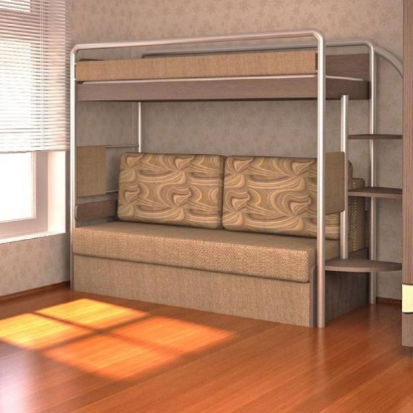 Vous pouvez choisir une option pour deux enfants. Dans de telles structures, le rôle du premier niveau est joué par un canapé qui, si nécessaire, peut être transformé en un lit de couchage. Cette conception peut être utilisée dans de petits appartements d'une pièce, où vous devez organiser le sommeil des adultes et des enfants.