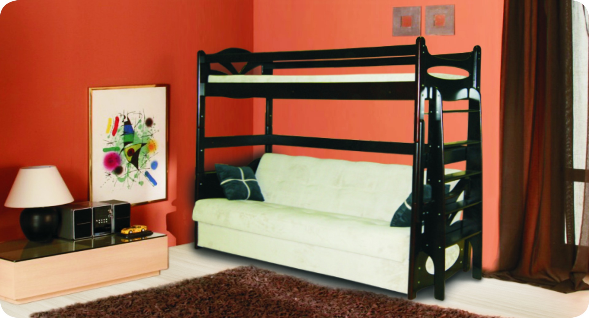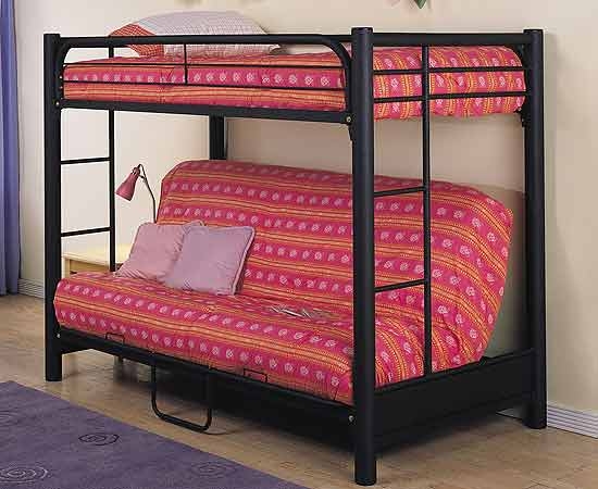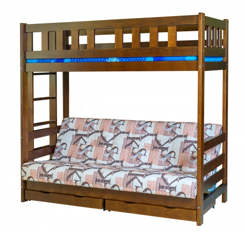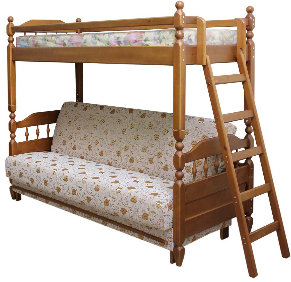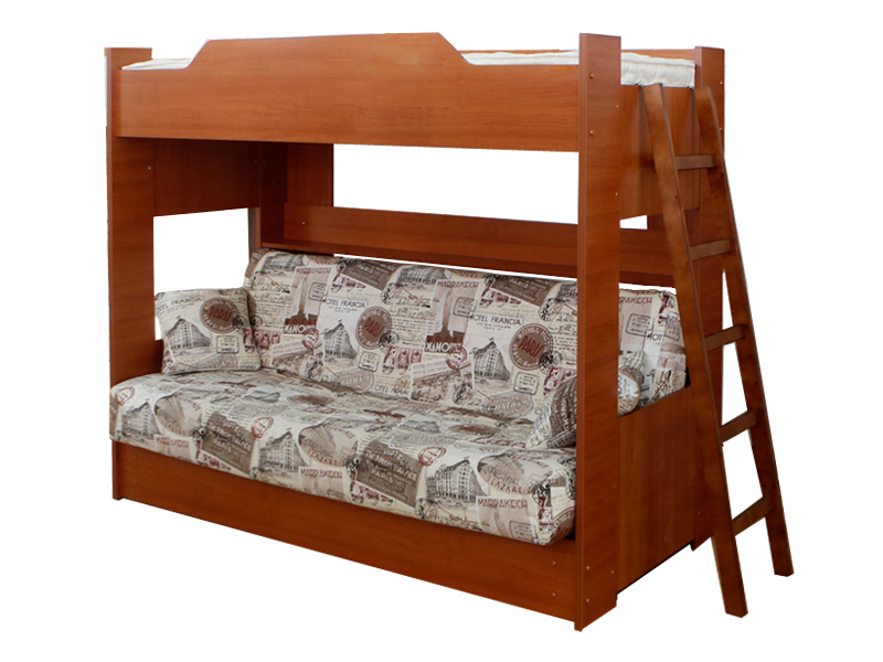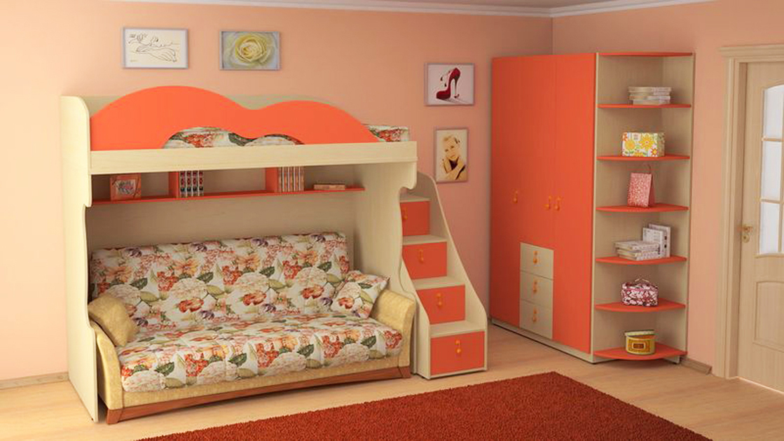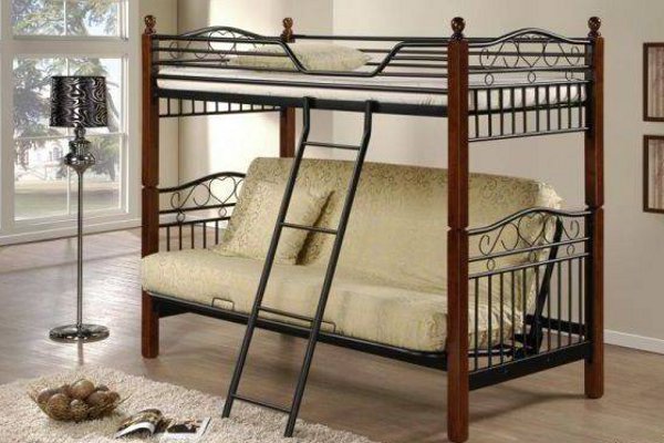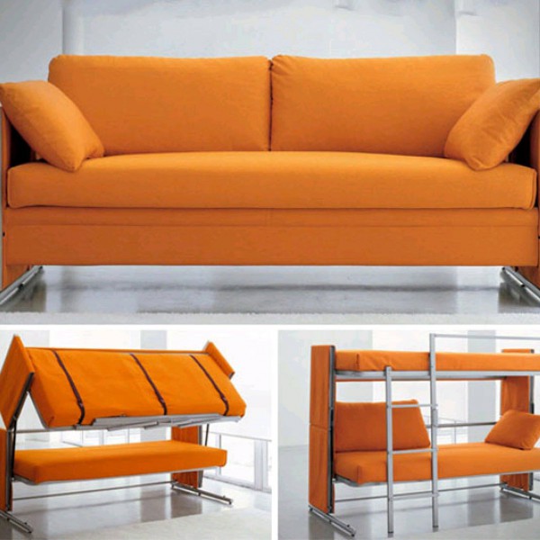 Vous pouvez choisir une option pour deux enfants. Dans de telles structures, le rôle du premier niveau est joué par un canapé qui, si nécessaire, peut être transformé en un lit de couchage. Cette conception peut être utilisée dans de petits appartements d'une pièce, où vous devez organiser le sommeil des adultes et des enfants.