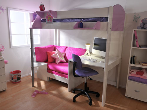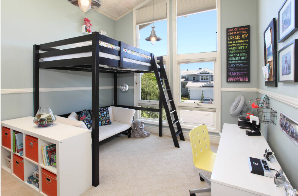 Un lit superposé peut avoir plusieurs variantes.Selon le lieu de son application, l'importance de chaque type de mobilier de ce type change également. Les magasins de meubles modernes proposent aux clients des modèles pour un enfant avec un bureau au premier étage et un lit au second. Il s'agit d'un meuble extrêmement fonctionnel, car il permet de placer rationnellement les fournitures scolaires et les livres dans les tiroirs et les étagères équipés de la première couche de la structure.