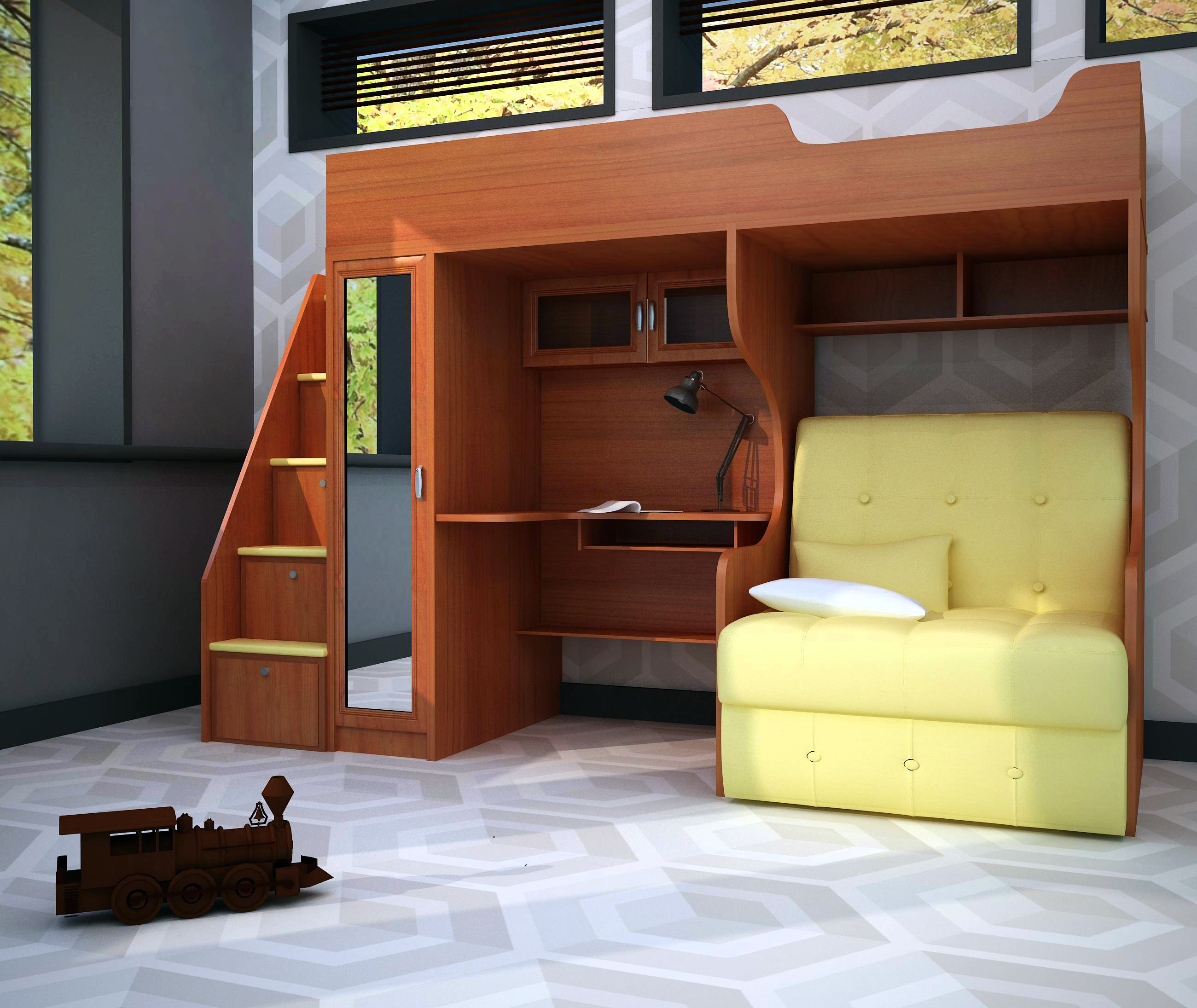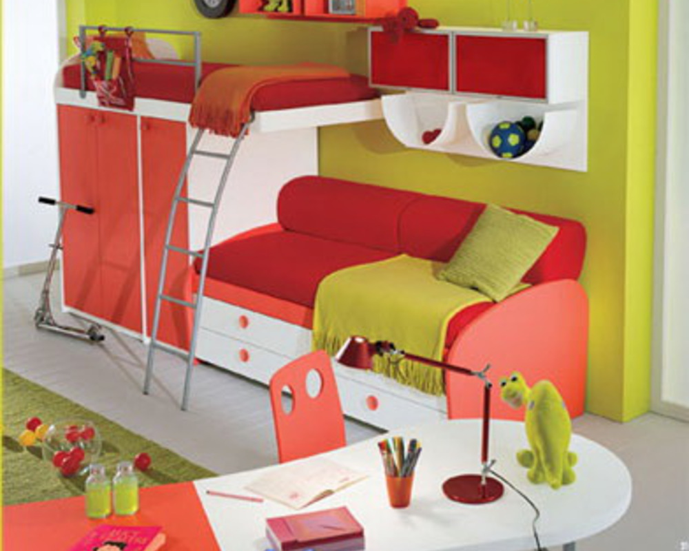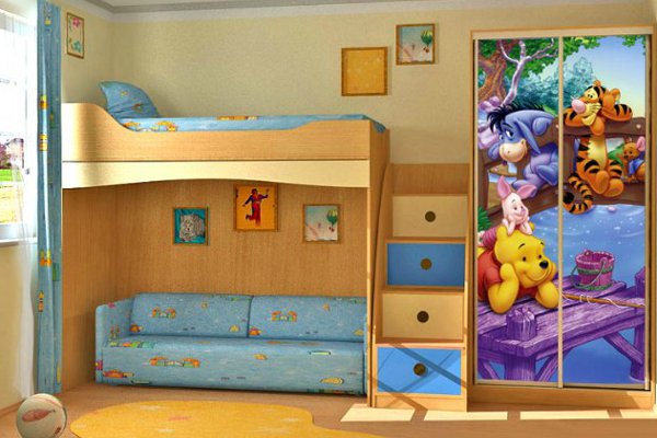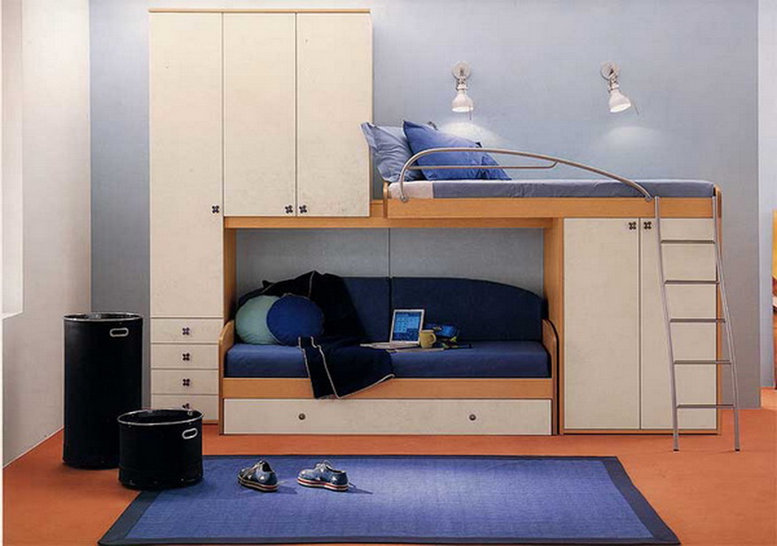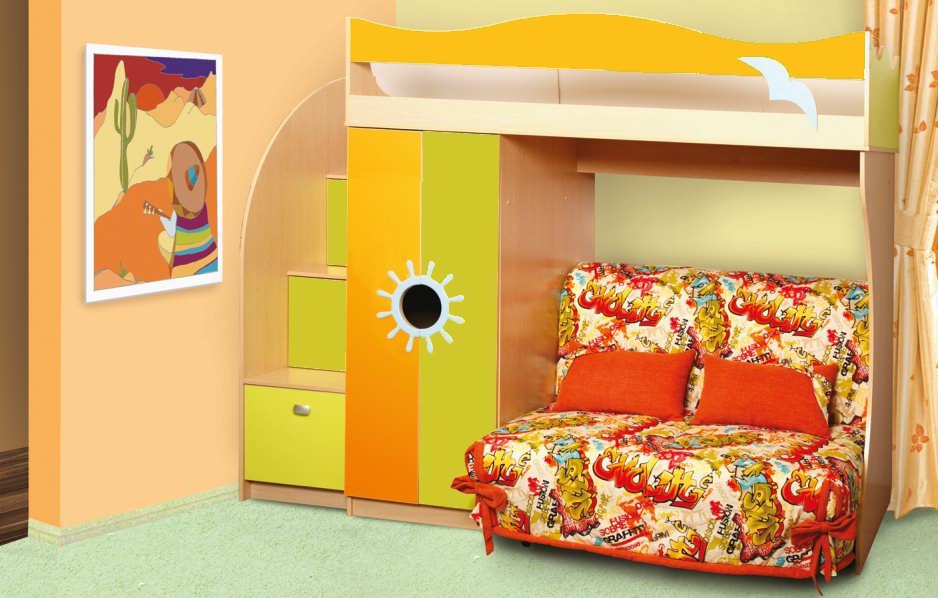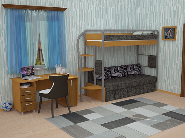 L'espace pour l'enfant doit être divisé en plusieurs zones, alors seulement il sera aussi confortable et fonctionnel que possible. Il devrait y avoir un endroit pour les jeux, la lecture de livres, le calme et le sommeil complet. Si la pièce ne diffère pas par des dimensions impressionnantes, cela ne fonctionnera pas si vous mettez ici un lit double, un canapé et une aire de jeux. Un lit superposé avec un canapé moelleux viendra à la rescousse.