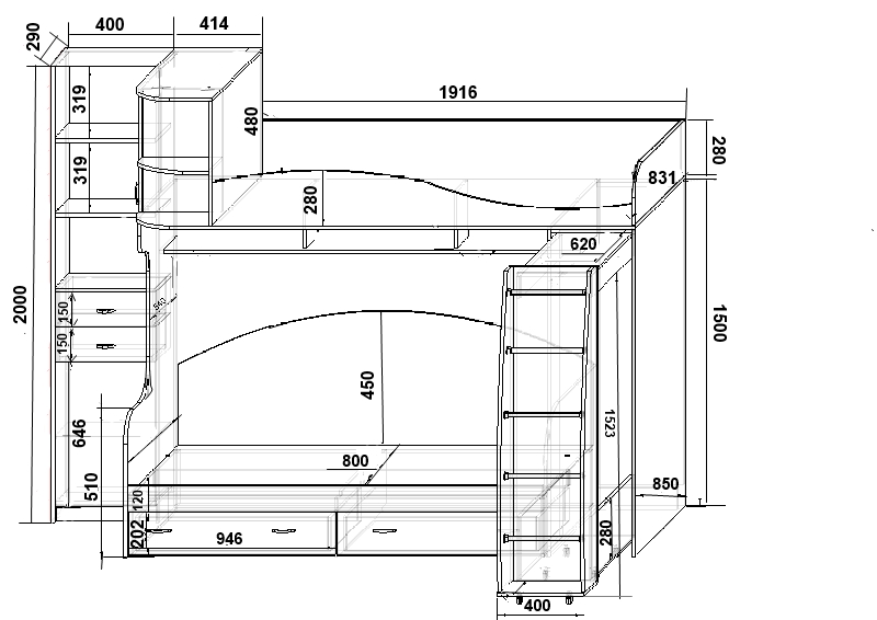 - sécurité - si le deuxième niveau est destiné à un enfant, il doit certainement avoir un côté limite d'une hauteur d'au moins 30 cm.Le lit ne doit pas avoir d'angles vifs, de boulons saillants, de trombones, les enfants ne se blesseront pas pendant leur sommeil ou jouer. Les escaliers menant au deuxième niveau doivent avoir des mains courantes confortables. Pour éviter que bébé ne trébuche, les marches dans les escaliers ne doivent pas être trop rares. La meilleure option est une échelle qui peut être fixée de différents côtés de la structure. Cela permettra au lit de s'adapter aux paramètres d'une pièce particulière. Si l'espace de la pièce le permet, il est préférable de choisir un modèle avec des tiroirs sous les escaliers. Il s'agit d'un espace de rangement supplémentaire pour les affaires de l'enfant ;
