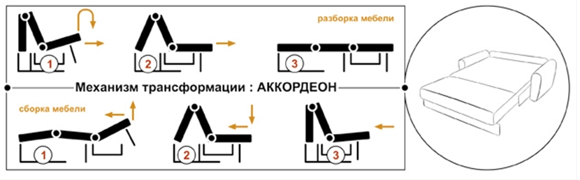 - accordéon - populaire en raison du fait qu'il a un matelas complet. Après la transformation du produit, il n'y a pas de recoins ni de cloisons dans le lieu de couchage, ce qui garantit un confort de sommeil élevé.