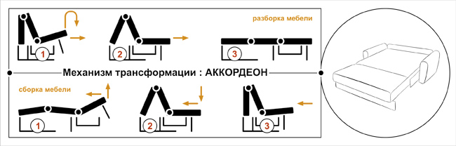 Comment transformer un canapé avec un mécanisme accordéon ? Tout est assez simple, il comprend selon le schéma: