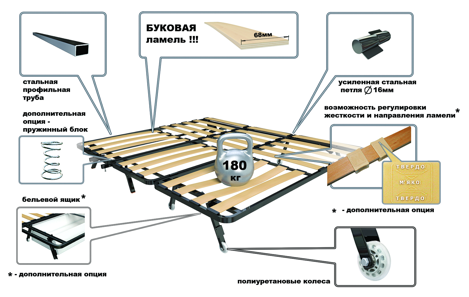 la base est constituée de lattes de bois, ce qui augmente la stabilité et la résistance de l'ensemble du produit.Ils peuvent supporter de lourdes charges, sans se casser, ni s'endommager;