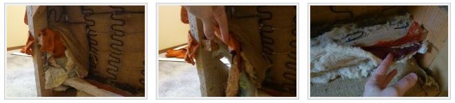 Les instructions étape par étape suggèrent qu'il est d'abord important de retirer complètement l'ancienne garniture du cadre du canapé. Même le mastic est retiré, car généralement après une longue période de fonctionnement, il est déjà expulsé et a perdu sa forme d'origine. Le cadre ouvert est libéré de divers supports et autres fixations. Il est important de s'assurer qu'il est durable et fiable, ainsi que adapté à une utilisation future.Si nécessaire, il est renforcé avec des feuilles de panneaux de fibres ou de contreplaqué.