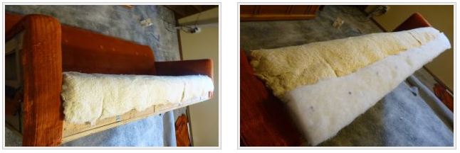Après cela, la fixation du caoutchouc mousse commence et il est important de choisir correctement ce matériau. Son épaisseur optimale est considérée comme étant de 40 mm, mais pour les flancs, on prend du caoutchouc poreux d'une épaisseur plus faible. Lors du choix, il est important de prendre en compte la densité du caoutchouc mousse, et une densité de 46 unités est considérée comme l'indicateur optimal pour le rembourrage de meubles rembourrés. S'il est trop bas, le caoutchouc mousse perdra rapidement sa forme et se déformera. Cependant, un chiffre trop élevé entraîne la création d'un rembourrage trop dur, ce qui réduit le confort lors de l'utilisation du canapé conformément à sa destination.