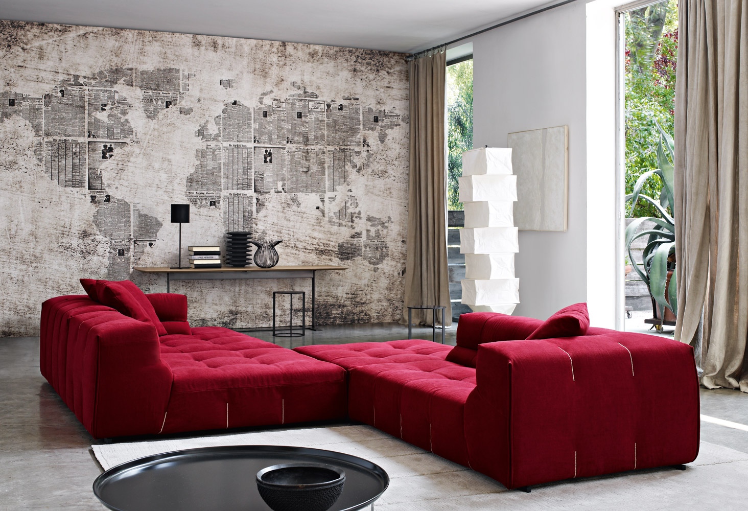 - un modèle où le canapé s'inscrit dans une palette monochrome de rouge et de ses nuances.