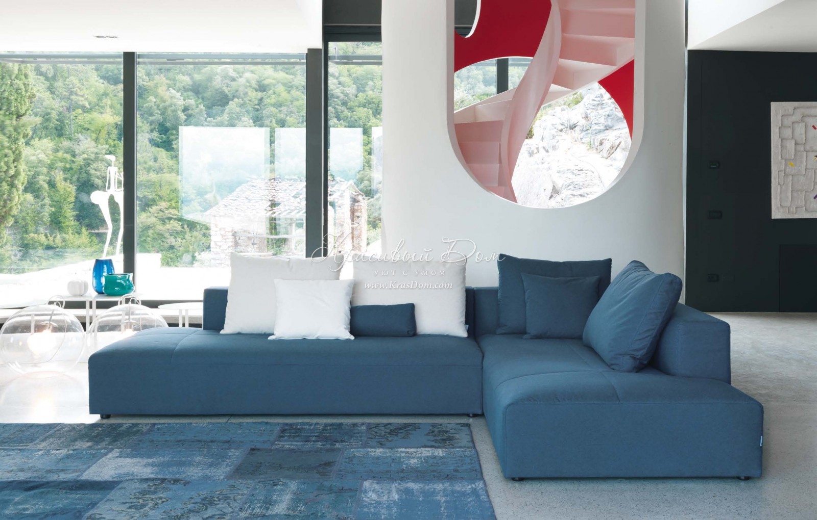 Le canapé dans des tons bleus et similaires s'intègre dans presque tous les styles modernes. Les plus appropriés pour cela sont le style moderne et scandinave, lorsque le canapé se distingue par une tache lumineuse sur un fond monochrome clair, attirant l'attention sur lui-même. Contemporain comprend également des éléments lumineux supplémentaires, par exemple des peintures et autres décors, avec une combinaison de rouge vif, jaune, noir, avec laquelle le bleu vif est en parfaite harmonie.
