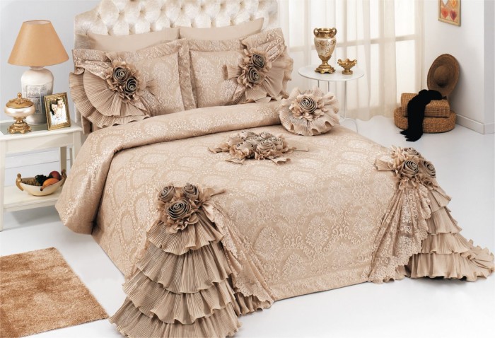 un beau couvre-lit décorera non seulement un lit double, mais deviendra également un élément principal de tout intérieur classique;