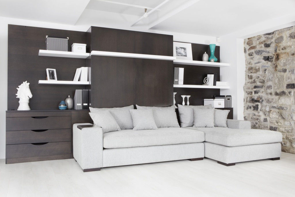 Une fois assemblé, le canapé convertible est une armoire montée verticalement et une fois déplié, il s'agit d'un lit horizontal standard. L'essence du mécanisme réside dans le fait que le lit de couchage assemblé est déguisé et ne surcharge pas l'intérieur étroit.