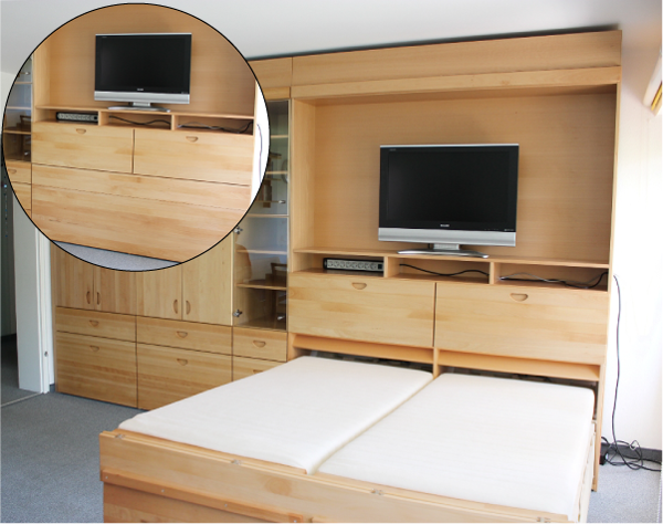 - au-dessus, il y a des casiers pour ranger des choses, des vêtements, du linge de lit, il y a un endroit pour installer une télévision à écran plasma;