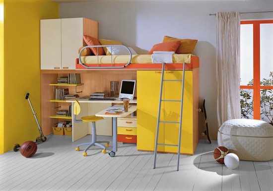 - un type de lit avec un complexe modulaire en dessous. Dans une telle option, il y a des meubles dans la partie inférieure qui peuvent être pliés dans la version que vous aimez. Un lit est alors placé au-dessus de la fenêtre, qui peut être escaladé par une haute échelle;